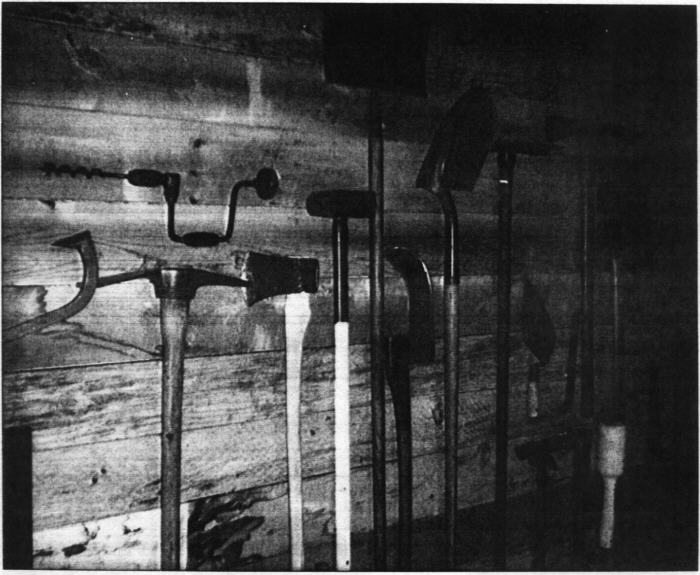 More CCC Tools, Showing Fire Beater, Sledge Hammer, Axe, Brace and Bit, Mattock and Shovel.