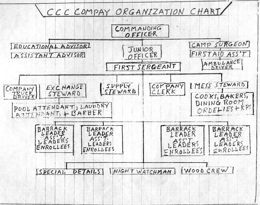 Other than the Top Tier, that being the Educational Advisor, Commanding and Executive Officer and Camp Surgeon, all other spots were Enrollees. Leadership positions would be Leaders, helped by Assistant Leaders. Some top spots would be "overhead" men, those who could stay as key men beyond the two year terms. Some would spend many years in the CCCs. Later in 1941 and 1942 some would become CCC Subalterns and susbstitute for Army men who were called to active duty.