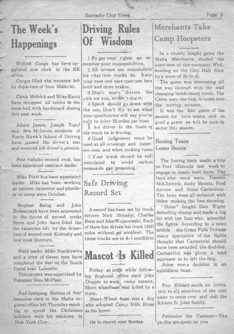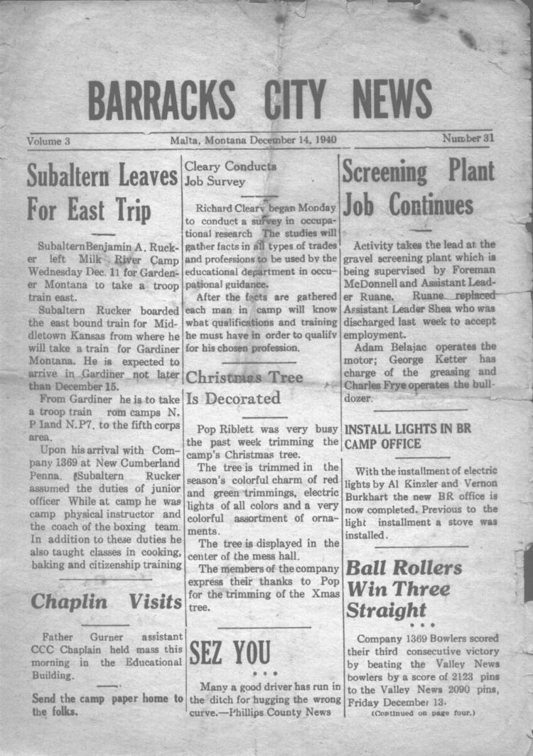 Barracks City News, Dec. 14, 1940, Volume 3, No. 31, Page 1, Page 2, Page 3, Page 4, Company 1369, Camp BR-69, Malta, Montana
