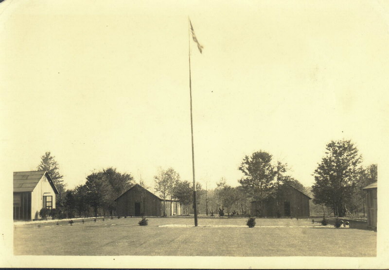 This is a nice well groomed camp parade ground with flagpole and a nice walkway complete with Army style mounted Cannon Balls (presumably stone or wood) flanking the walkway. The buildings on the left and center are barracks which each would hold about 50 men at maximum capacity. The building on the right may also be a barracks or may be a Mess Hall, Showers, Medical Office or other company building. It is not clear.