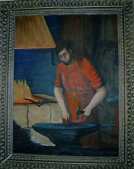 Blacksmith at Anvil, Oil on Canvas, app. 18"x24", Betty Justin, Copyright 1976