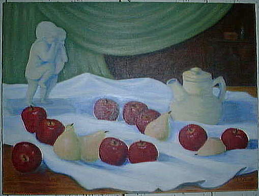 "I set up a still life. But I didn't like the compostion so I changed it. I made the tea pot the dominant piece, put the Statue to the side and then added more fruit and lined the fruit up as a path to the statue. I don't like it, I am going to do it over. I like the colors I like what I did to the apples." - Betty Justin