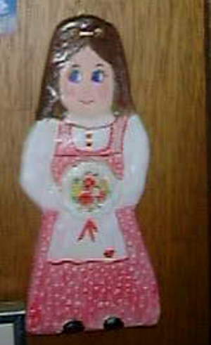 Girl with Bouquet, Glaze on Fired Clay, app.3"x6", Betty Justin, Copyright 1995