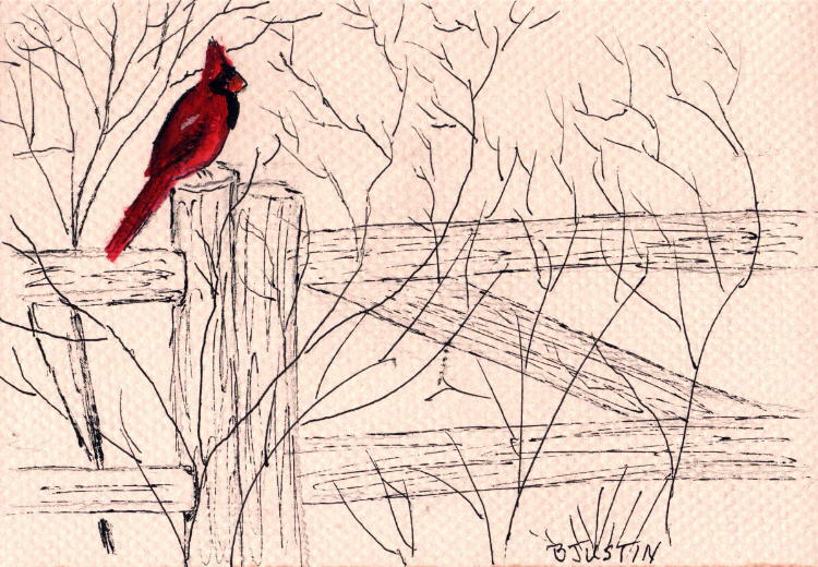 Curator's Note, this was the first piece of art Betty did after her husband, Jim Justin, passed away. He used to work for a company called Cardinal and the Cardinal had always been our favorite bird before that in any case. They live in our area, frequent our feeders and the local pair nested in our firethorns in the Spring of 1997. Cardinals have been sort of a family theme, and my Mom seems sometimes to think of my Dad when she sees a Male Cardinal, or such is my impression. I know I do. In any case, I believe this piece has a bit more emotion in it than one might expect on a Card.