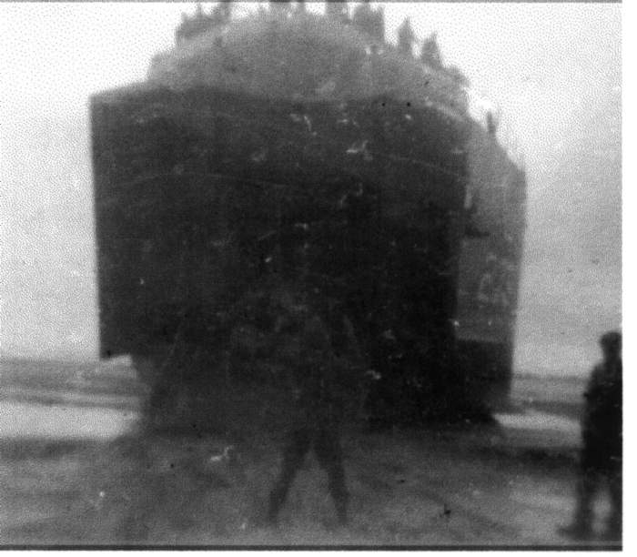 A vehicle, it appears to be a tank, being guided down the bow ramp of the LST 279 onto Utah Beach. The LST 279 has just brought this vehicle and its unit to France from England. Sorry about the quality of these photos but after fifty six years I am glad to still have them.When the ship beaches, it goes in as the tide is receding and drops its stern anchor on the way. The ship is unloaded and waits for high tide to return. At the first sign of flotation, the stern anchor is hauled in and, with the aid of the engines in reverse, pulls the ship off the beach to an area it can safely turn around.