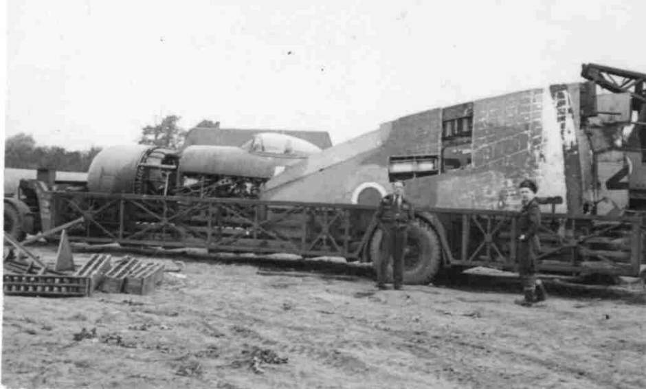 This was an aircraft that had run out of fuel and had to make an emergency landing. Unfortunately it, or the pilot, chose to land in a canal, as it swept into make a crash landing it picked up a cow that was grazing on the bank, throwing the poor beast up over the canopy. The aircraft came out of it with very little damage but the pilot was drowned. The `plane loaded is a Hawker Tempest Mark 5 ( cousin to the Typhoon) looks like a Bristol Centaurus Radial engine and the wings stowed alongside are eliptical much like a Spitfire's, the cockpit canopy very much like a Typhoon.