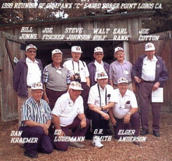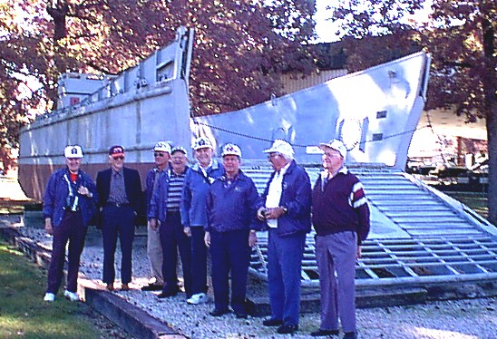 Veterans of Co. "C" 543rd Engineer Boat and Shore Regiment in front of a LCM, Ft. Eustis Va. Reunion, October 2000, Left to Right Steve Johnson, Kemper Kellog, Walt Rolf, Elger Anderson, O.R. Smith, Dan Kramer, Ed Leudemann, Earl Rank