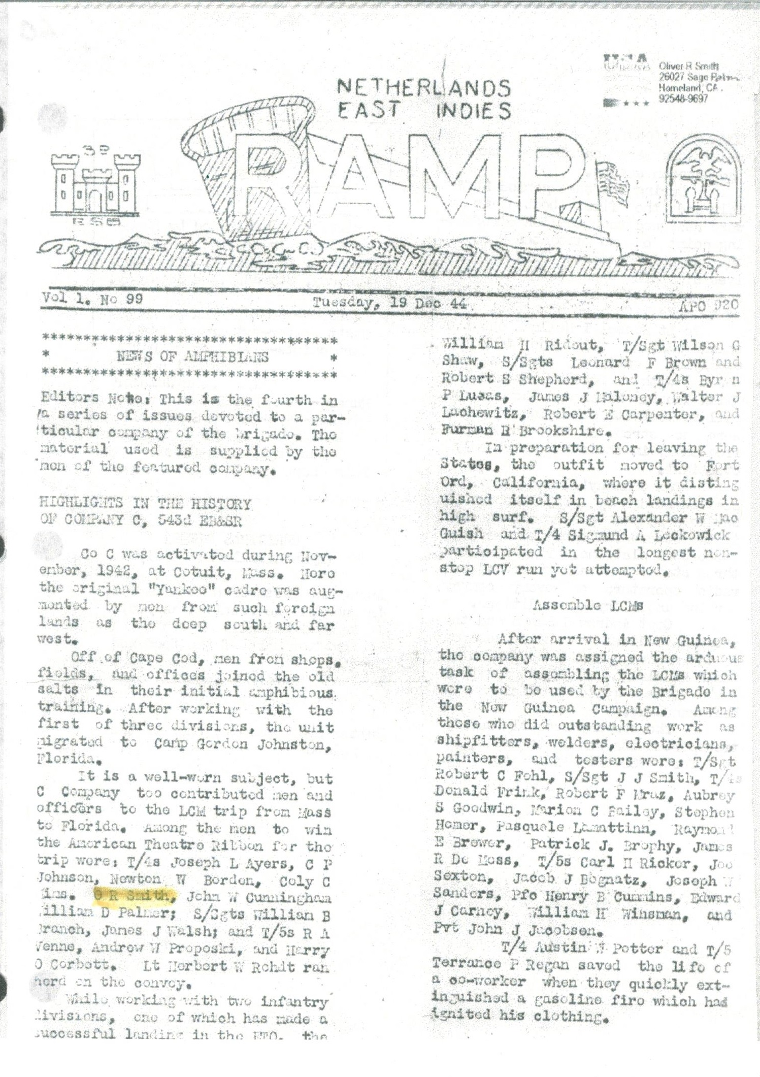 "Ramp", Vol. 1 No.99, Netherlands East Indies, 543rd Engineer Boat and Shore Regiment newsletter, Tuesday, 19 Dec 1944, Page One.