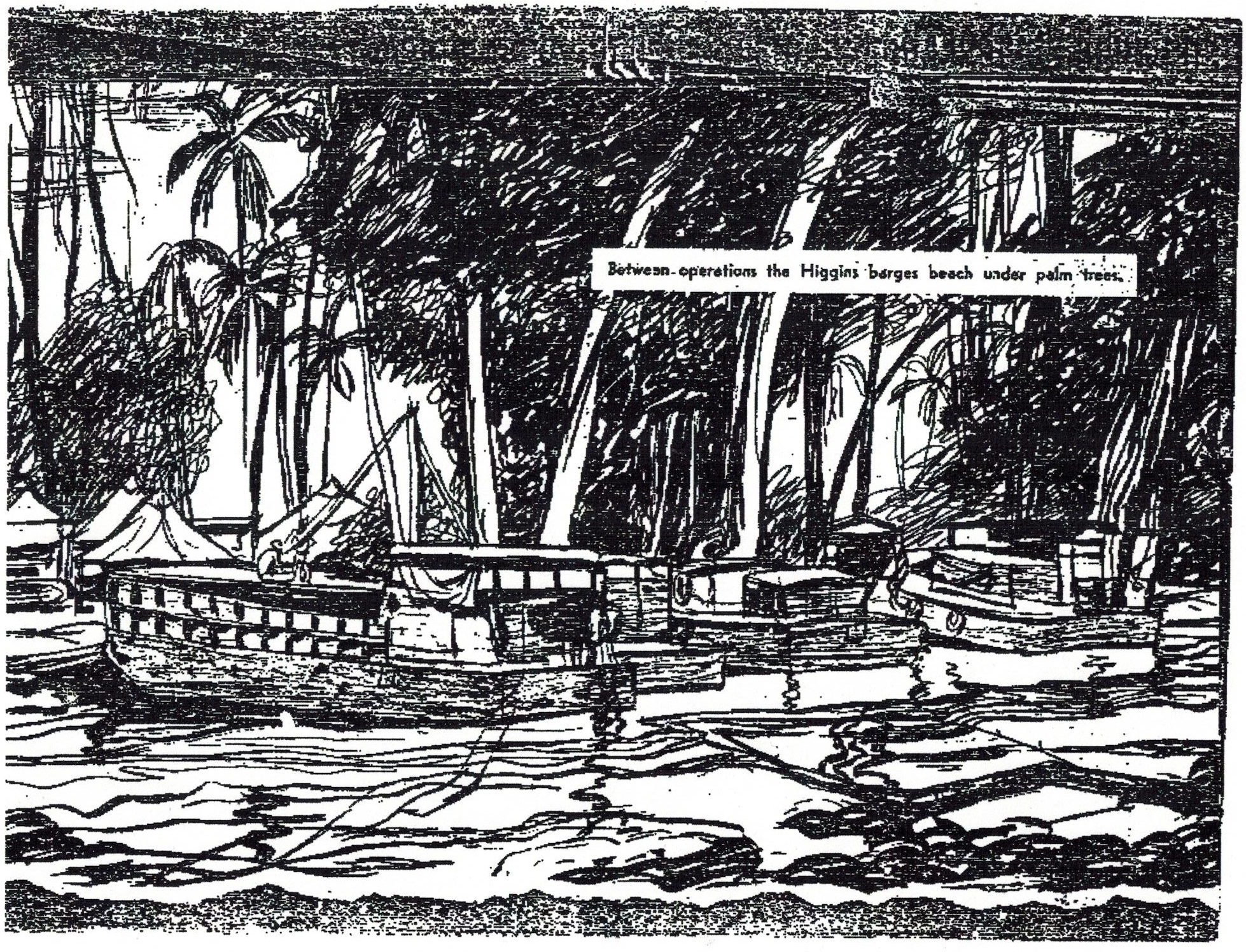 Between Operations, the Higgins barges beach under palm trees, by Joseph Steffanilli, Yank, illustration of C Co., 353rd EBSR