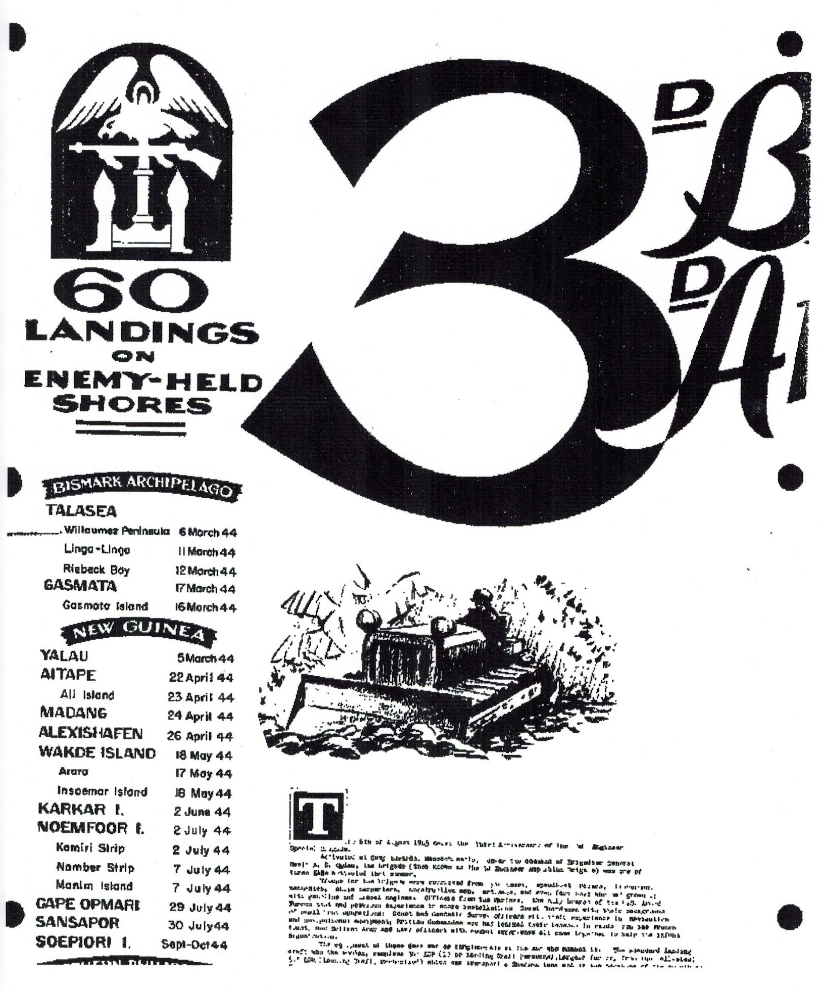 A little background. In Cairns Aust. the 2nd brigade had assembled 901 LCVP for the Australians, the US Navy & the 2nd & 3rd Brigades. The need was for LCMs. Liberty Ships could only carry 2 or 3 LCMs deck loaded. A plan was worked out to sectionalize the LCM into some say 3 sections, as I recall it was 9 sections for shipping. So they could bring a lot more LCMs in one ship load. The 411 Base Shop unit moved to Milne Bay New Guinea. They started setting up the assembly plant with the 5211 base unit, but found they didn't have enough people to do the job. So the 3rd Brigade (us ) were added to form a complete work force. Schools were set up for fitters & welders training people while the plant was being finished. The 563rd joined them in Oct. 43.