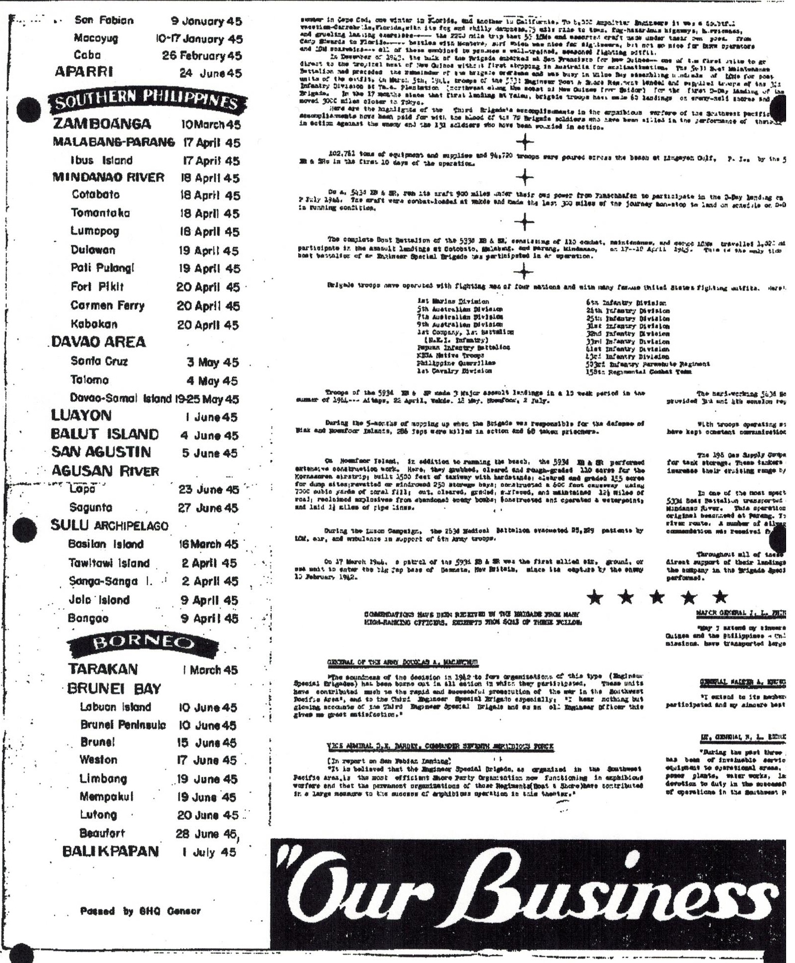 Loading out for Mindoro P. I. Jan. 22, 1945Mindoro P. I. the conversion of the LCS to The J Boat. & Prep For the Landing at Zamboanga, Mindanao. The landing at Zamboanga, Basalan Is. Trips to Cotobato, Parang.