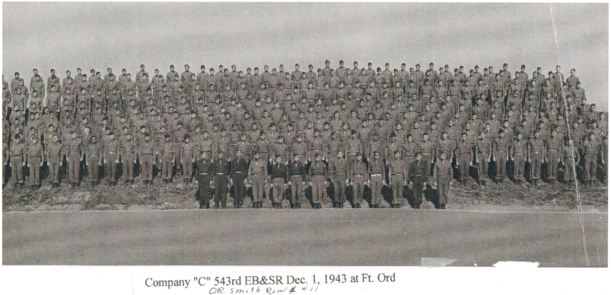 Group Photo, Co. C, 543rd EB&SR, Dec 1, 1943 at Fort Ord, O. R. Smith is Row 4m Number 11