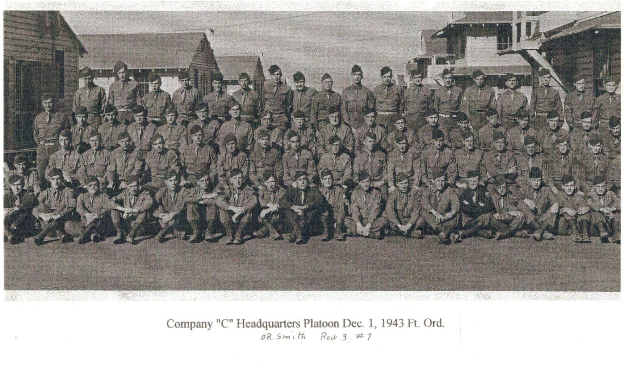 Group Photo, Co. C Headquarters Platoon, Dec 1, 1943 at Fort Ord, O. R. Smith is Row 3 Number 7