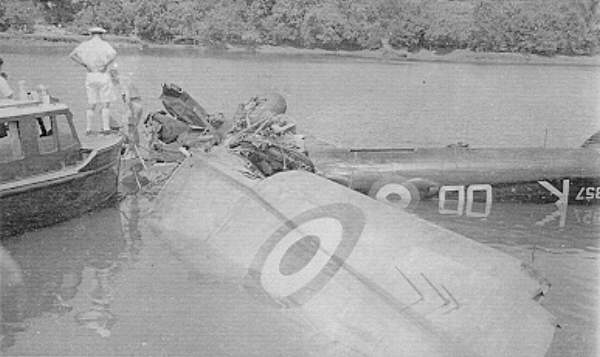 Brigand OB--K of 45 Squadron crashed on June, 15, 1951 at about 11:30 AM when the starboard propellor broke free causing the engine to also be torn from the aircraft. This caused the aircraft to be uncontrollable. The Starboard undercarriage dropped down and that also made it more difficult to control, just like a Duck with one leg! You can see whats left of it and the wing in foreground is the one missing the engine and you can just make out the flat area, the bulkhead where it was attached. Gas was spewing out and the aircraft was gyrotating, Alan could get no control at all except for the first couple of seconds, his words will never leave me, the plane was changing attitude all the way down, at first the engine bulkhead was acting like a dive brake just on one side, after that the controls gave up and she was in a dive, we hit the ground first at a slight angle, a bit of luck, (This all was surmised at the inquiry) the nose came away Alan was slung out for about 50/70 ft.into the water, it bounced on and over and `then` hit the water, look closely at the wings, they are right side up both heading North, to your right, the fuselage is upside down and pointing South, to your left!!! the front, minus the nose was completely smashed and mangled as far back as my normal position, it would have been impossible for any one to have survived in the crew compartment. When I tried to get into there it was apparent that Vernon would not be coming out.