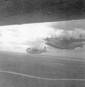 On the 22nd of March 1952 we left for Iwakuni via Hong Kong, arriving the next day. We did our usual stuff in the Tsushima Straits a couple of times. Before we left for our return to Singapore the Skipper was asked if he could take back with us 20 nurses from the Victoria Order of Nursing that had finished their tour of duty in Korea, and being a perfect gentleman, replied in the affirmative. We left Iwakuni on the 27th of March en- route for Hong Kong, heavy laden with our passengers and considerable luggage. Our cook, with lots of help was seeing to the needs of our guests. Our altitude in normal weather was usualy between 1000 to 2000ft over the sea. We were roughly three quarters of the way between Okinawa and the southern tip of Formosa (now Taiwan) far away out to sea at about 2000ft when, without any warning all 4 engines slowly came to a complete stop, silence, then the skipper yelled out (in an unfamiliar high pitched voice) "Peter Peter quick, send S.O.S." and I can assure you I needed no prompting at all, I was already set up on my radio because I had been working Okinawa and Hong Kong, I ripped off an S.O.S. to Okinawa, our last known position and our problem, they answered immediately, and would sound the alarm, meanwhile the Nav had rushed our actual position to me which I passed on right away. Every thing was happening so fast, and of course, controlled panic was occuring, we were descending in a glide towards the sea hoping to make what is known in the trade as a splash landing, praying that we wouldn't break up on hitting the surface. Down below, in the wardroom and area, some of the crew were rushing around helping the passengers put on their Mae West life jackets, when suddenly at about 500 ft, the 2 port engines burst into life, and seconds after, the 2 starboard engines kicked in which really delayed the descent and very gradually we edged upwards. I still kept the state of emergency in place while up front they were checking everything out on the instruments, also I was informed by Okinawa that 3 Mustangs had just become airborne from the U.S. base at Formosa, with lindholm dinghy equipment, this was carried under the wings, 3 cylinders each side, and when dropped, each side had 3 dinghys tethered together a distance apart and hopefully drift towards the survivors, also, I was told that 2 - B.17's would soon be airborne, each with an Airborne Lifeboat. We were assuring the nurses that it is O.K. and not to worry, but by the look on their faces they knew we were not sure about it. Every 5 minutes I would transmit a steady signal for the Mustangs and the B17s using their A.D.F.for them to home on to us. We had no V.H.F. contact with anyone because we were way out of range. I had contacted Hong Kong on the W/T and. they were aware of all that was going on. A little later it was decided to down grade the S.O.S to a stand by situation, and advise that the Mustangsand B17s could be called off, all of which was done. By that time we were heading west to Hong Kong, we landed and when ashore wanted to kiss the ground, if no one had been looking I would surely have done so, Obviously, the aircraft had to be given a complete and exhaustive inspection and that it would take some days at least. It was also decided that the Nurses would go on to Singapore via one of our passenger Valetta's, you could hear a great sigh of relief from them when they heard that, there was no way they said, that they would want go back in the Sunderland, in case it happened again. Can you blame them? The Sunderland was hauled out and sat on the apron for 3 days while engineers and fitters poured over it, engines, all fuel systems etc etc. All were checked and double-checked. During the second day one of the engineers discovered something that may have been wrong with the air intakes for the fuel tanks, I am not an engineer, but it was to do with the fact that the intakes had a small filter fitted in them and they all appeared to be partially blocked, even though they had been replaced recently, it was something that the very experienced engineers had never seen before. I can only guess that the tanks required an amount of air as well as the pumps that fed the fuel to the engines. They continued to run the engines and do more tests and finally our skipper was satisfied with the results. We left Hong Kong for Seletar, but we all were ready, just in case. We never had any further trouble with the engines.