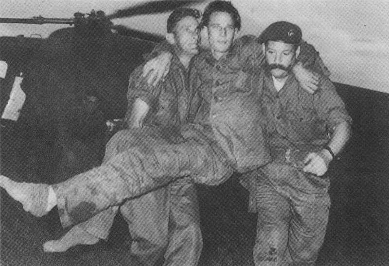 Pte. Tom Hogg, wounded in action, brought out by helicopter for
