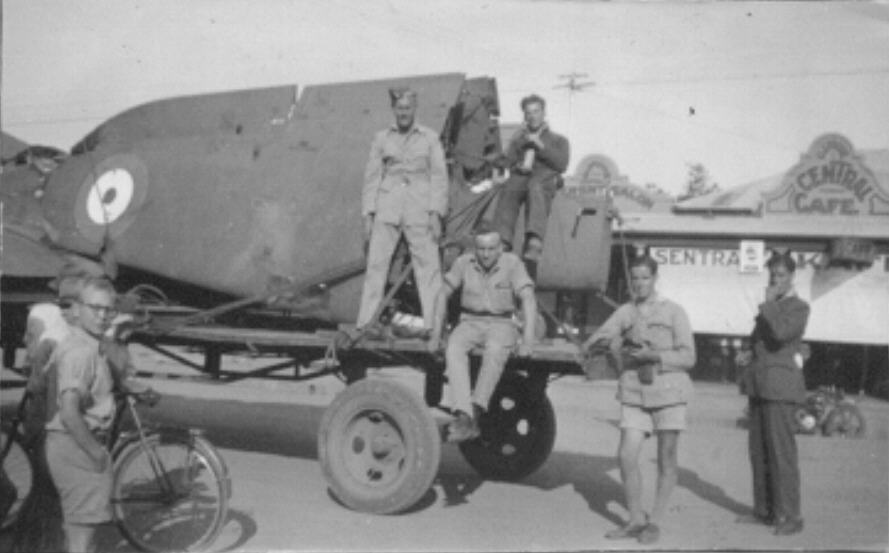 Loaded ready to begin journey back to base, Jock Gardener is leaning on back of trailer, Spike ? sitting on trailer, Blackie? sitting on 'plane's tail.