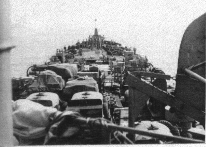 Looking Forward from the superstructure of our LST {land ship tank}. This LST was a ship that had been sold or given or whatever to the Japanese. I have no idea what the number or name was. The crew was all Japanese. We had no contact with them, we ate our C-rations they had their fish heads & rice. This ship was about 250ft long. The bow opened up and a ramp is dropped for loading and unloading. There is a ramp in side so vehicles can be driven to the top deck.
