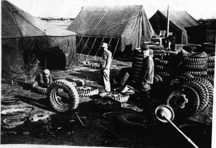 Tire Shop The Tire Shop where the men are repairing tires, Junk Tires with broken side walls etc., and where you can see repaired tires ready for remounting Kimpo Airfield, Korean War, 1950 ----- Oliver R Smith orlesmith@lasercom. net Links Back To Air Force Photographs Back To Marine Photographs Back to Biography of Oliver Smith LINKS BACK TO JUSTIN ORAL HISTORY CENTER BACK TO JUSTIN ORAL HISTORY MARINE PHOTOGRAPHS PAGE JAMES F. JUSTIN CIVILIAN CONSERVATION CORPS MUSEUM For links and documents on CCC Please Share your Stories! E-mail me to share or discuss or with any questions!