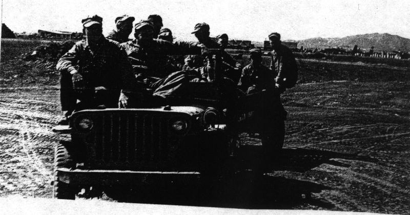Jeep and Trailer loaded with Service Crew The Driver is S/Sgt Raford Hoyle. The other passengers include Cpl. Floyd Laney, Sgt. Brewis. Cpl. Bobby Carter, Sgt Wilson . That is all I can pick out. S/sgt.Hoyle is picking up the flight line people & bringing them in for Chow. Kimpo Airfield, Korean War, 1950 ----- Oliver R Smith orlesmith@lasercom. net Links Back To Air Force Photographs Back To Marine Photographs Back to Biography of Oliver Smith LINKS BACK TO JUSTIN ORAL HISTORY CENTER BACK TO JUSTIN ORAL HISTORY MARINE PHOTOGRAPHS PAGE JAMES F. JUSTIN CIVILIAN CONSERVATION CORPS MUSEUM For links and documents on CCC Please Share your Stories! E-mail me to share or discuss or with any questions!