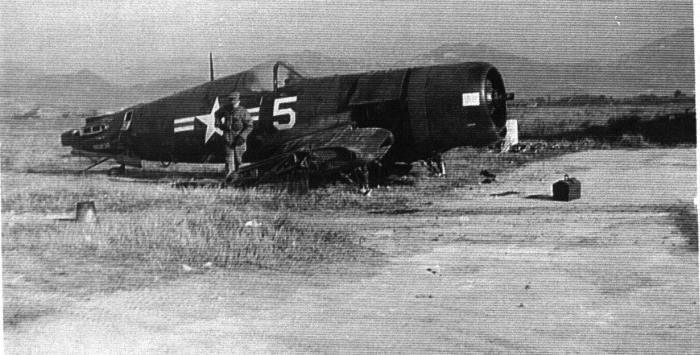F4U Corsair Wreckage This F4U was either broken down or damaged on the ground and has been reduced to salvage. Spare parts from this plane probably kept others flying for some time. The man in front of the Corsair is Corporal Malone of the 33rd Marine Service Squadron, 33rd Marine Air Group. Po Hang Airfield, Korean War, 1951 ----- Oliver R Smith orlesmith@lasercom. net Links Back To Air Force Photographs Back To Marine Photographs Back to Biography of Oliver Smith LINKS BACK TO JUSTIN ORAL HISTORY CENTER BACK TO JUSTIN ORAL HISTORY MARINE PHOTOGRAPHS PAGE JAMES F. JUSTIN CIVILIAN CONSERVATION CORPS MUSEUM For links and documents on CCC Please Share your Stories! E-mail me to share or discuss or with any questions! Photograph Copyright 2000 Oliver Smith Webpage Copyright 2000 John Justin