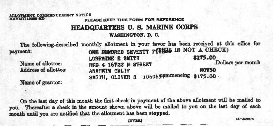 Allotment Notice Notification Lorraine Received from the Marine Corps about the allotment I had made out at El Toro Marine Air Station. It took 136 days for her to get the allotment of $175 per month. I got home before she had finished paying back her folks. ----- Oliver R Smith orlesmith@lasercom. net Links Back To Air Force Photographs Back To Marine Photographs Back to Biography of Oliver Smith LINKS BACK TO JUSTIN ORAL HISTORY CENTER BACK TO JUSTIN ORAL HISTORY MARINE PHOTOGRAPHS PAGE JAMES F. JUSTIN CIVILIAN CONSERVATION CORPS MUSEUM For links and documents on CCC Please Share your Stories! E-mail me to share or discuss or with any questions! Photo Copyright Oliver Smith 2000 Webpage Copyright John Justin 2000