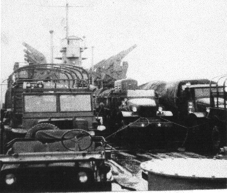 LST Looking Aft LST to Inchon Korea This LST {land ship tank} was a ship that had been sold or given or whatever to the Japanese. I have no idea what the number or name was. The crew was all Japanese. We had no contact with them, we ate our C-rations they had their fish heads & rice. This ship was about 250ft long. The bow opened up and a ramp is dropped for loading and unloading. There is a ramp in side so vehicles can be driven to the top deck. Trucks and Jeeps tied down for sea. Note the davits and landing craft. August 1950 ----- Oliver R Smith orlesmith@lasercom. net Links Back To Air Force Photographs Back To Marine Photographs Back to Biography of Oliver Smith LINKS BACK TO JUSTIN ORAL HISTORY CENTER BACK TO JUSTIN ORAL HISTORY MARINE PHOTOGRAPHS PAGE JAMES F. JUSTIN CIVILIAN CONSERVATION CORPS MUSEUM For links and documents on CCC Please Share your Stories! E-mail me to share or discuss or with any questions! Photo Copyright Oliver Smith 2000 Webpage Copyright John Justin 2000