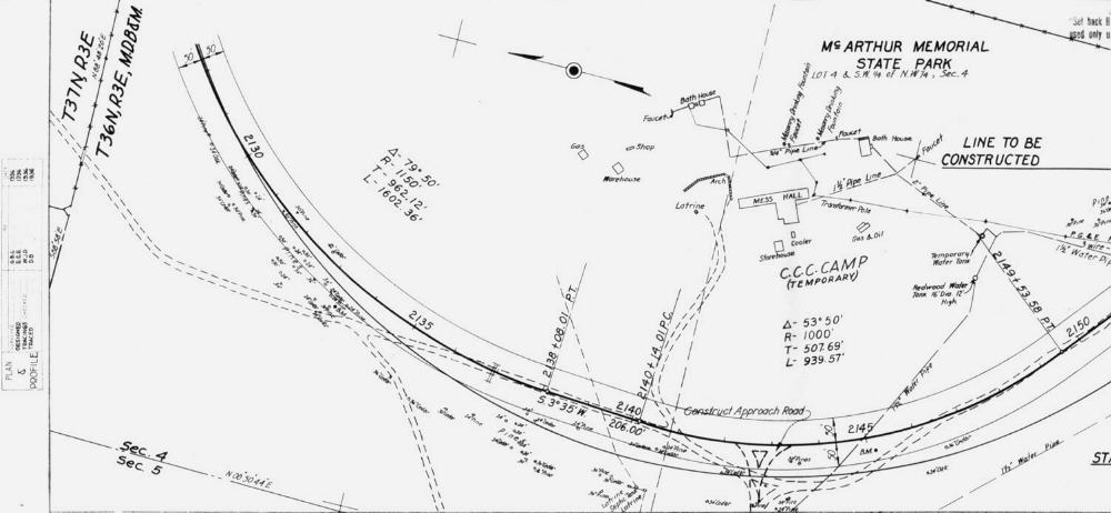 The CCC camp at McArther State Park just to the north of Burney California. this is from an alignment map done by California Dept. of Highways in 1936 when they were constructing state highway 89 and the CCC was constructing the state park.