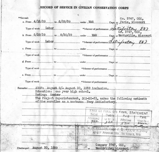 Jasper N. Terry, CCC Man, Company 3747, Paris Missourri & Wentzville, Missouri