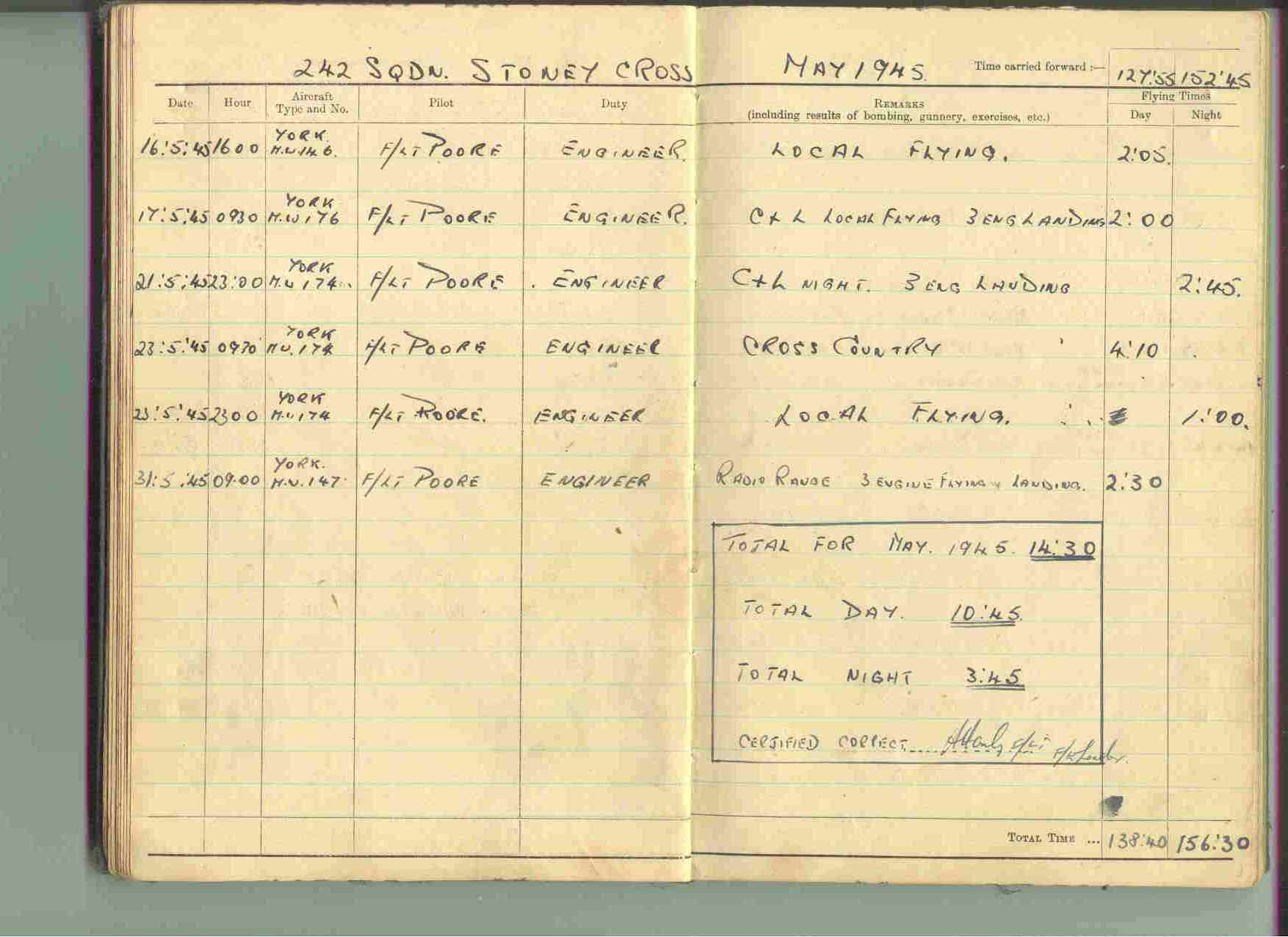 Reg Miles Flight Log, 242 Squadron, Transport Command, Stoney Cross, May 1945 Page One