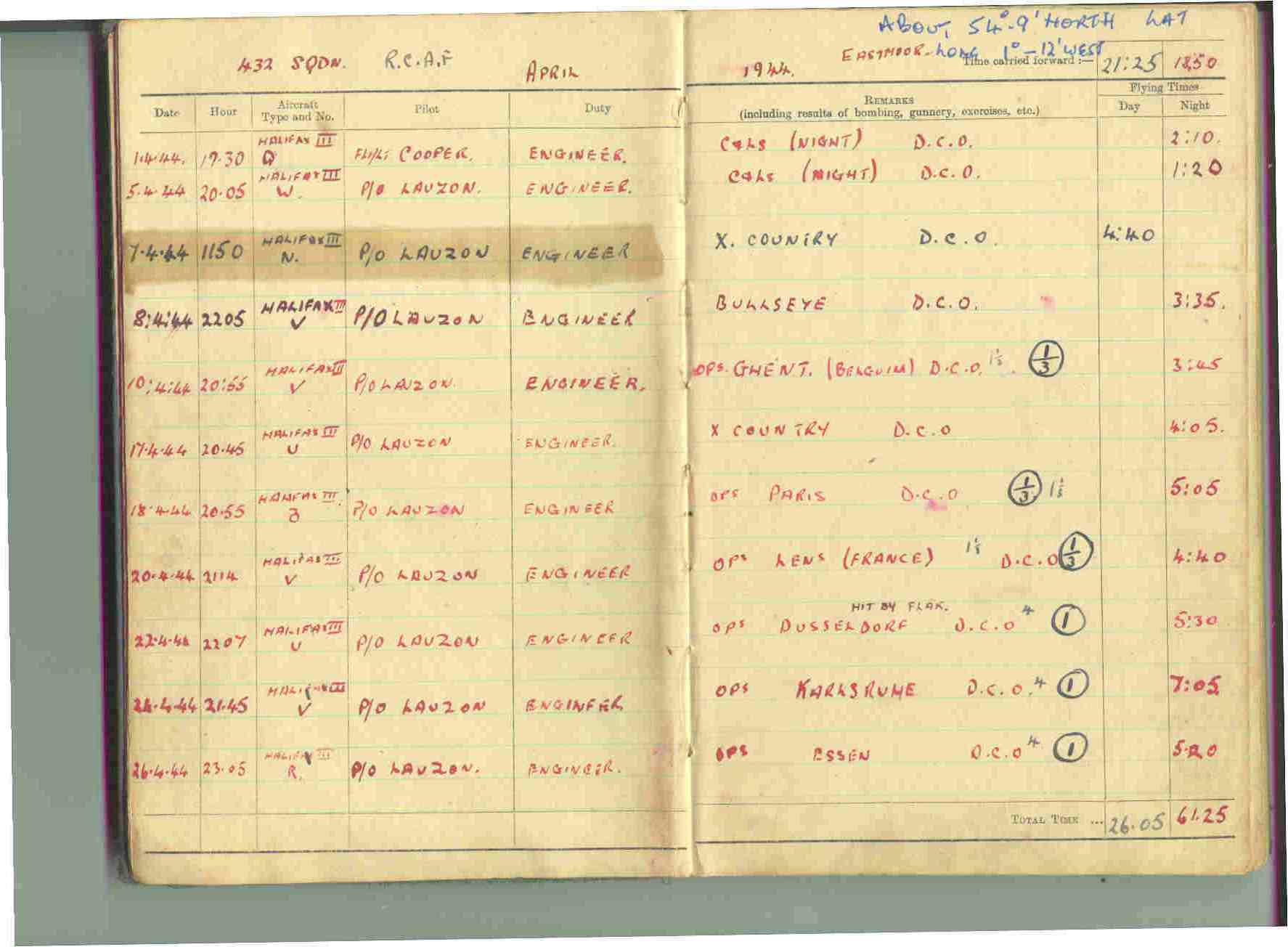 Some of the terms on the Log Book shall require explaining. The Lat and Long at the top I have added recently when I bought MS World Atlas and was able to pin point the airfield locations. You will note the first column is the date to help you follow the sequence. This log book records all my flying both training, operational and at Transport Command. C&Ls circuits and landings very boring and mainly for the pilot and engineer to frighten them as much as possible, D.C.O. duty carried out D.N.C.O Duty Not carried out. P.O Lauzon was my first operational pilot, others mentioned on this first page and perhaps elsewhere were senior pilots who had done at least one tour of operations and were being rested before doing another tour of at least 30, all were very much more frightened of the 'sprog' pilot than of anything the Boche could throw at them!! PO is Pilot Officer and is really a rank to ensure that the person will not put up any "blacks' and behave like an officer and a gentleman, probationary period usually 6 months. FO is not Flight Officer which is a female rank in the WAAF but Flying Officer.