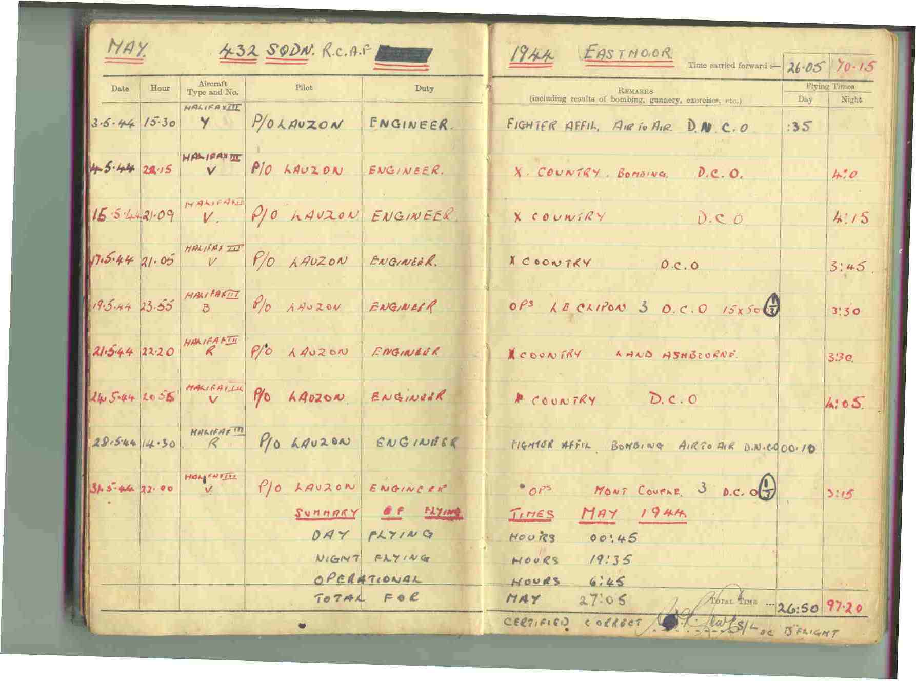 Some of the terms on the Log Book shall require explaining. The Lat and Long at the top I have added recently when I bought MS World Atlas and was able to pin point the airfield locations. You will note the first column is the date to help you follow the sequence. This log book records all my flying both training, operational and at Transport Command. C&Ls circuits and landings very boring and mainly for the pilot and engineer to frighten them as much as possible, D.C.O. duty carried out D.N.C.O Duty Not carried out. P.O Lauzon was my first operational pilot, others mentioned on this first page and perhaps elsewhere were senior pilots who had done at least one tour of operations and were being rested before doing another tour of at least 30, all were very much more frightened of the 'sprog' pilot than of anything the Boche could throw at them!! PO is Pilot Officer and is really a rank to ensure that the person will not put up any "blacks' and behave like an officer and a gentleman, probationary period usually 6 months. FO is not Flight Officer which is a female rank in the WAAF but Flying Officer.