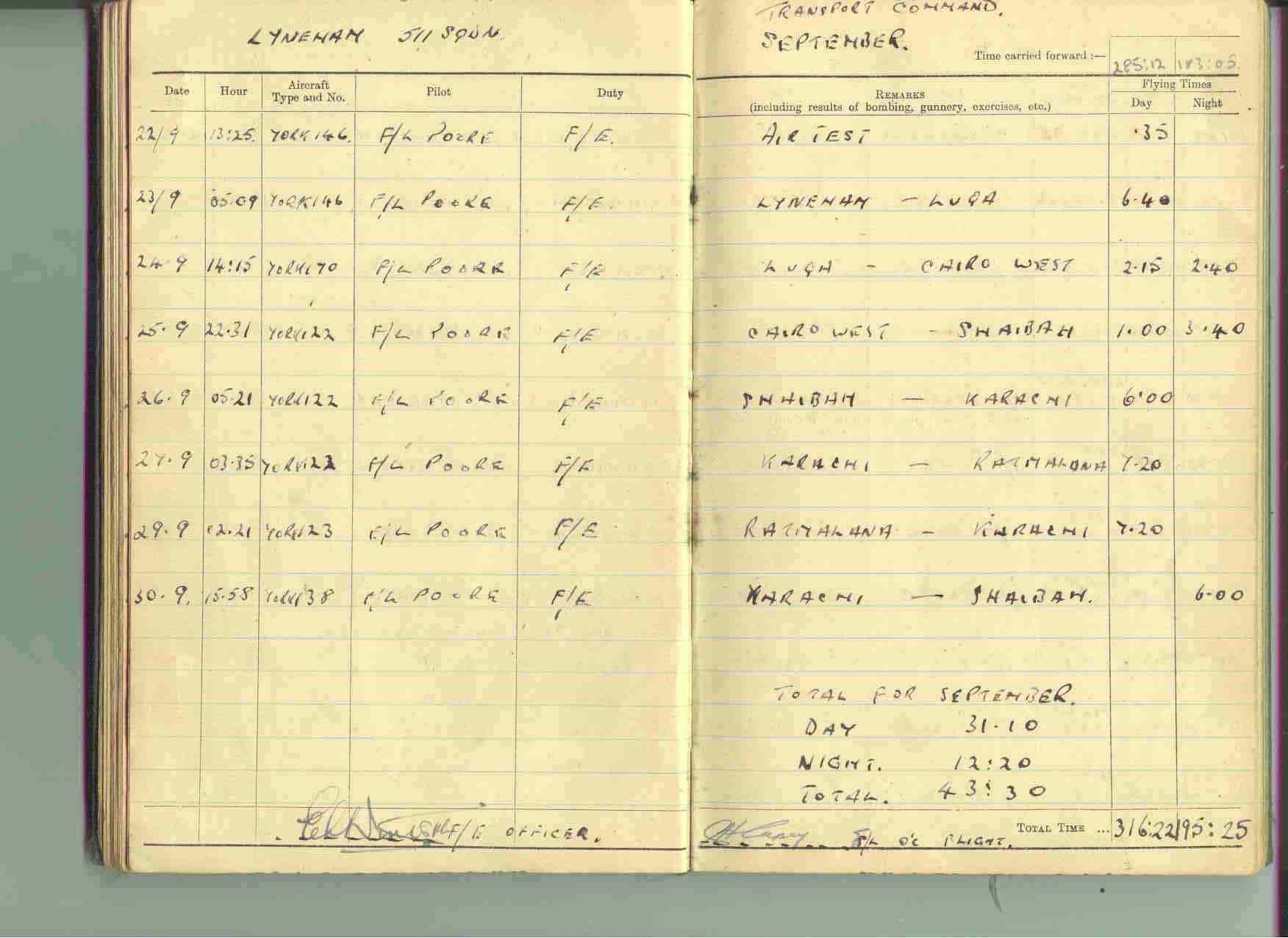 Reg Miles Flight Log, 511 Squadron, Transport Command, Lyneham, Page One, September 1945