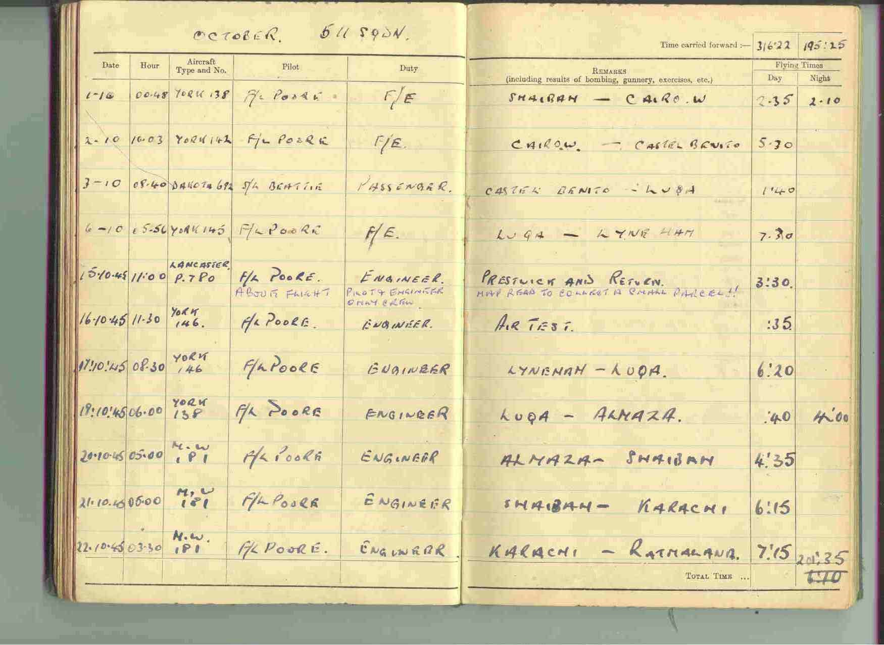 Reg Miles Flight Log, 511 Squadron, Transport Command, Lyneham, Page Two, October 1945