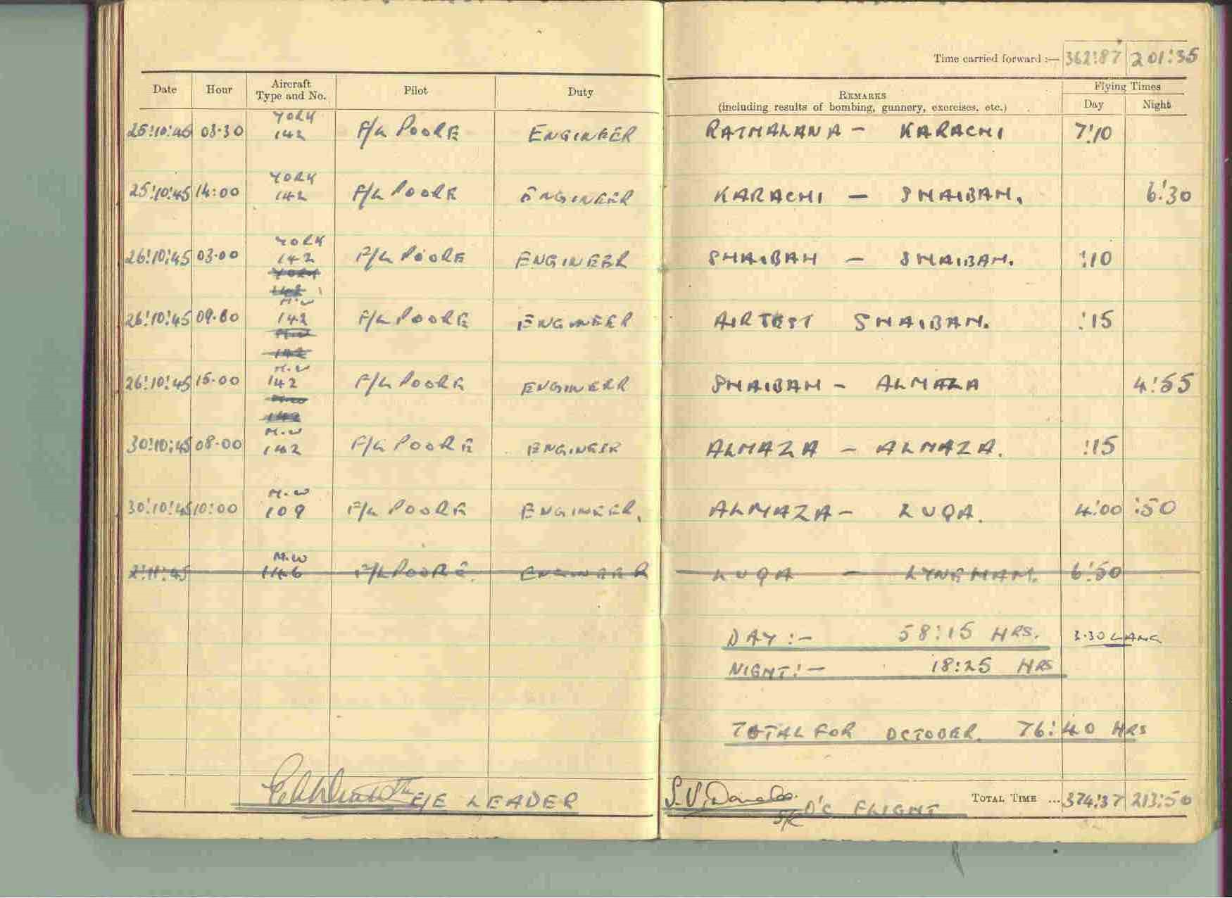 Reg Miles Flight Log, 511 Squadron, Transport Command, Lyneham, Page Three, October 1945