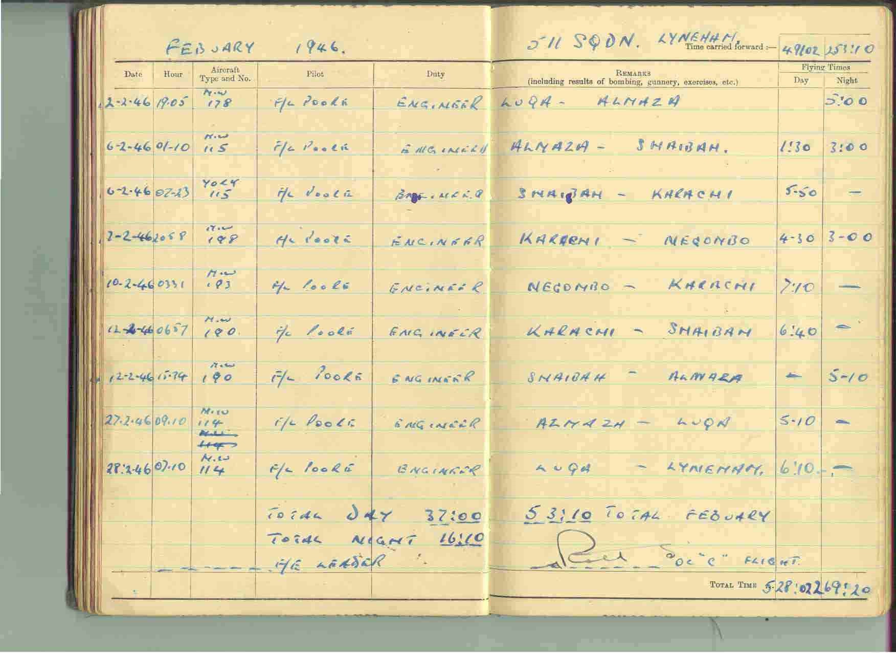 Reg Miles Flight Log, 511 Squadron, Transport Command, Lyneham, Page Eight, February 1946