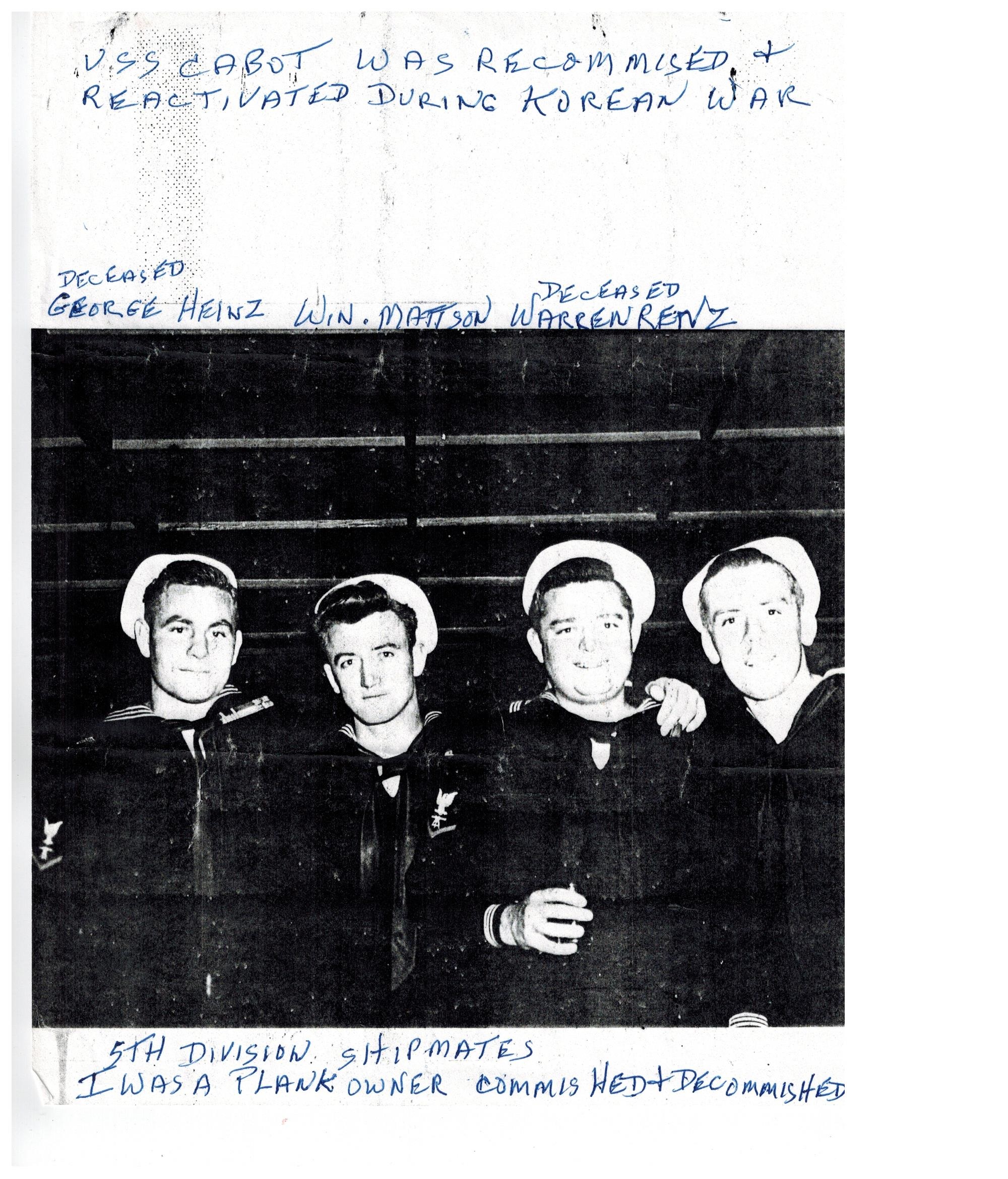 5th Division Shipmates, George Heinz, Win. Mattson, Warren Renz, (fourth name not given)