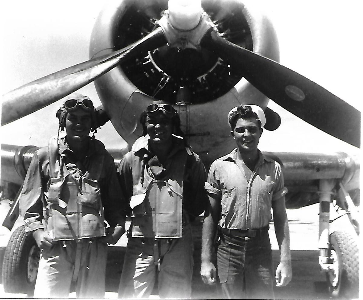 My dad, Frank W. Nadeua, is on the left, his pilot is in the center. The man on the right is a Plane Captain which we Army guys would call a crew chief. Also, the plane in this picture is a Douglas Dauntless. His unit returned to Hawaii in Dec. 1944 where his squadron was issued Curtiss Helldivers.
